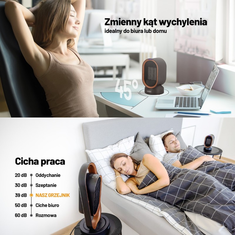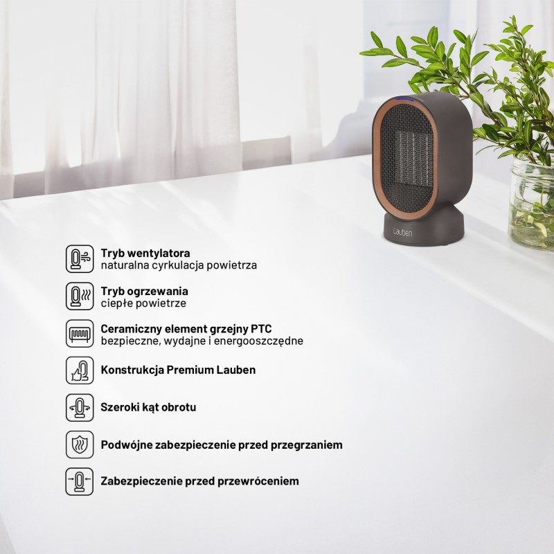 Lauben Desk Fan&Heater 2in1 600BB to świetne rozwiązanie do domu, domku letniskowego i biura, gdy potrzebujesz odrobiny ciepła. Bezpieczną pracę zapewnia ceramiczna grzałka PTC, która zapewnia również energooszczędność. Tryb ogrzewania zapewnia komfortową temperaturę w prosty i szybki sposób.