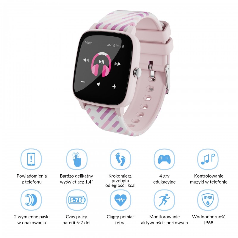 Inteligentny zegarek dla dzieci LAMAX BCool, czas pracy baterii do 7 dni, mierzenie kroków, tętna i aktywności sportowej, analiza snu, wodoodporność IP68, kontrola nad muzyką, bardzo delikatny wyświetlacz 1,4“, obsługa Android/iOS, 4 gry edukacyjne, dwa paski w pakiecie, smukły design dla dziecięcej ręki, język polski